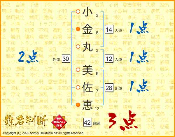 小(3画)金(8画)丸(3画) 美(9画)佐(7画)恵(12画)