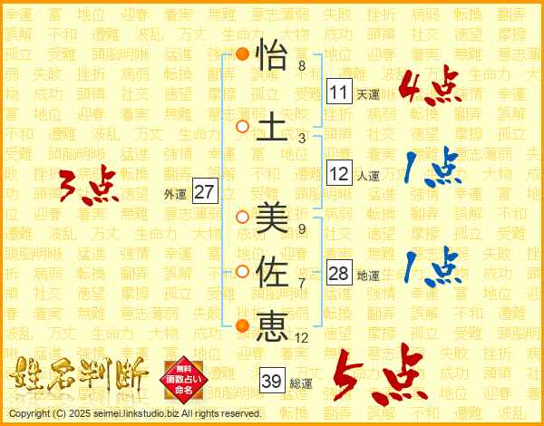 怡(8画)土(3画) 美(9画)佐(7画)恵(12画)