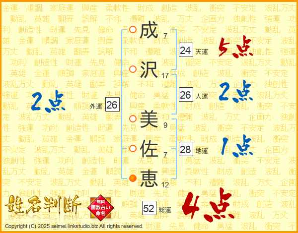 成(7画)沢(17画) 美(9画)佐(7画)恵(12画)