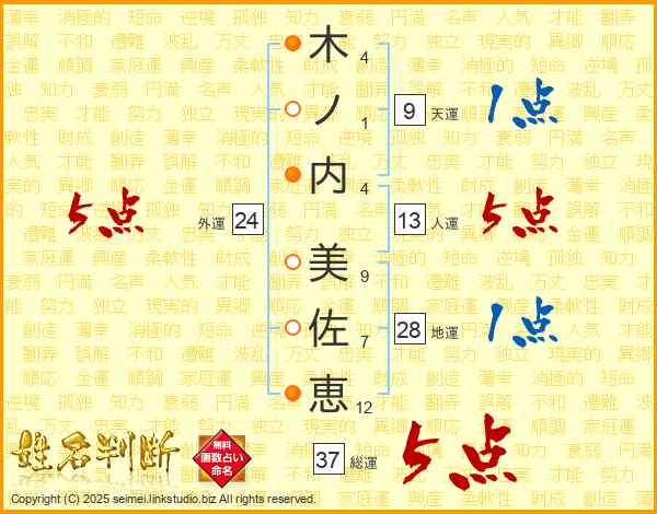木(4画)ノ(1画)内(4画) 美(9画)佐(7画)恵(12画)