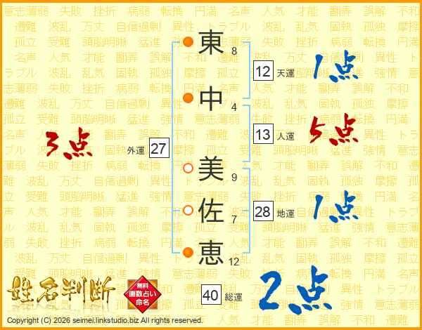 東(8画)中(4画) 美(9画)佐(7画)恵(12画)