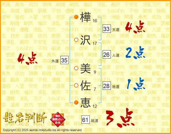 樺(16画)沢(17画) 美(9画)佐(7画)恵(12画)