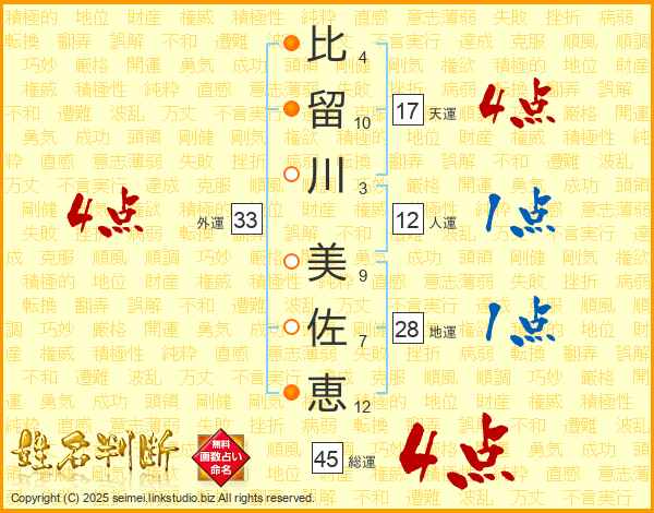 比(4画)留(10画)川(3画) 美(9画)佐(7画)恵(12画)