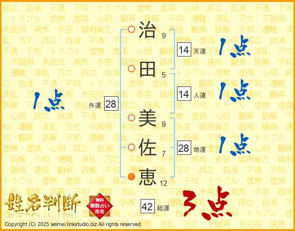 治(9画)田(5画) 美(9画)佐(7画)恵(12画)