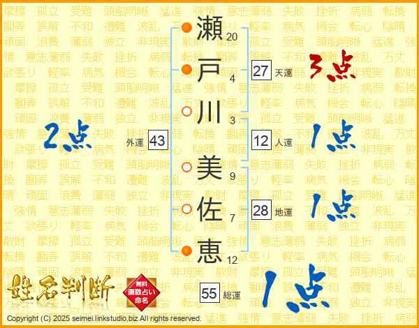 瀬(20画)戸(4画)川(3画) 美(9画)佐(7画)恵(12画)