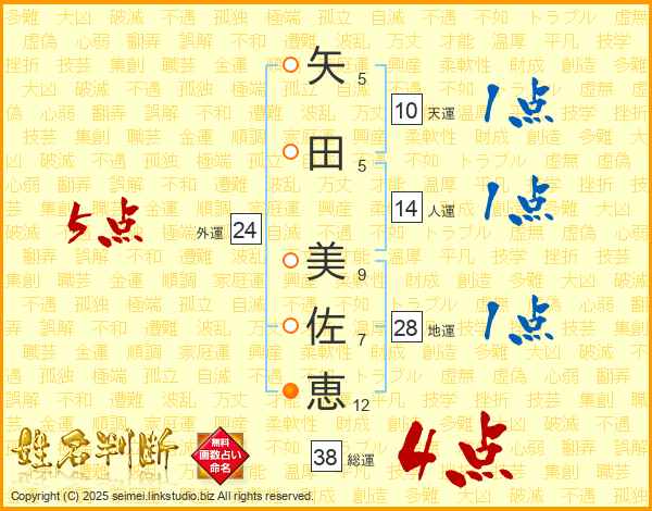 矢(5画)田(5画) 美(9画)佐(7画)恵(12画)