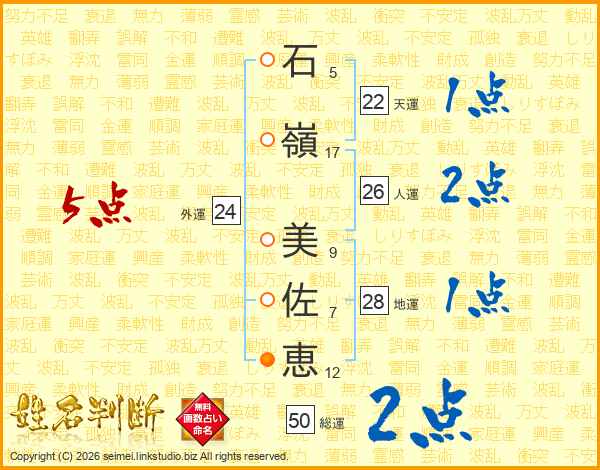 石(5画)嶺(17画) 美(9画)佐(7画)恵(12画)