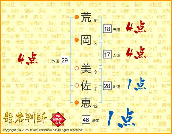 荒(10画)岡(8画) 美(9画)佐(7画)恵(12画)