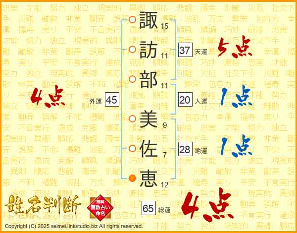 諏(15画)訪(11画)部(11画) 美(9画)佐(7画)恵(12画)