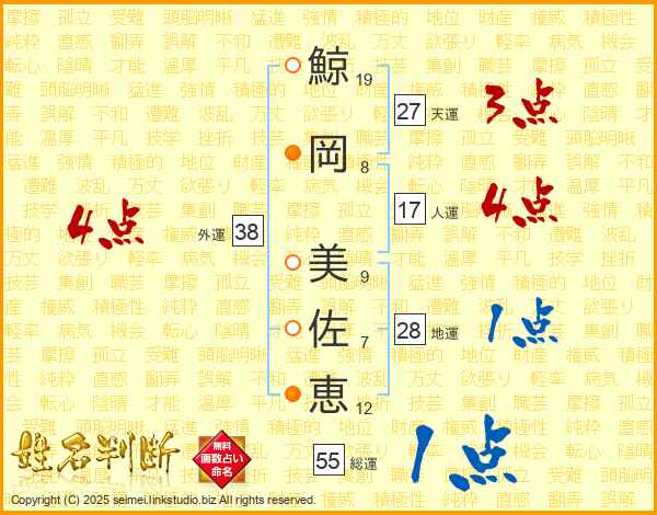 鯨(19画)岡(8画) 美(9画)佐(7画)恵(12画)