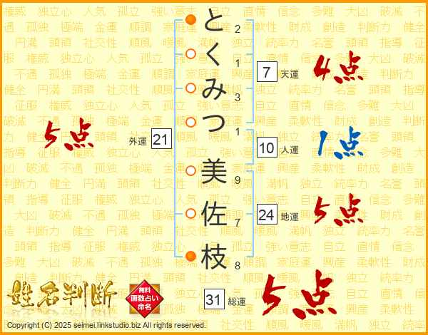 と(2画)く(1画)み(3画)つ(1画) 美(9画)佐(7画)枝(8画)