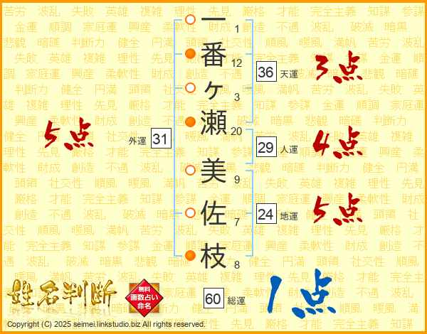 一番ヶ瀬美佐枝さんの地運は24画の5点!