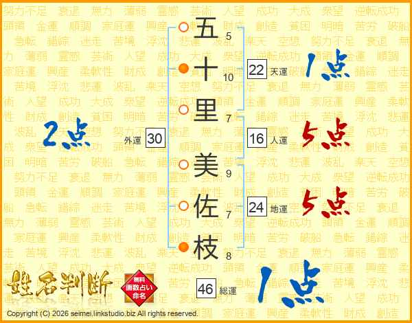 五(5画)十(10画)里(7画) 美(9画)佐(7画)枝(8画)