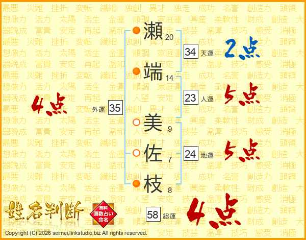 瀬(20画)端(14画) 美(9画)佐(7画)枝(8画)
