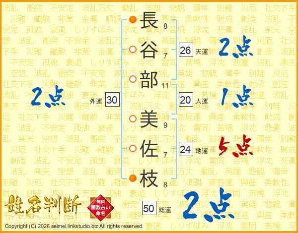 長(8画)谷(7画)部(11画) 美(9画)佐(7画)枝(8画)