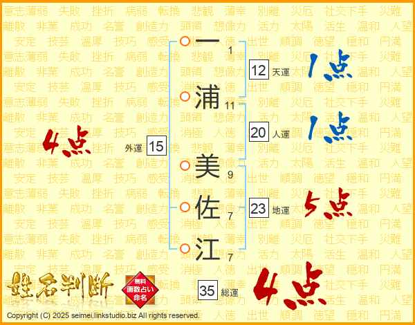 一(1画)浦(11画) 美(9画)佐(7画)江(7画)