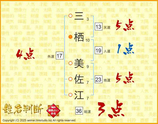 三(3画)栖(10画) 美(9画)佐(7画)江(7画)