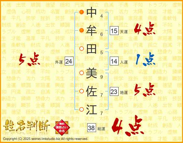 中(4画)牟(6画)田(5画) 美(9画)佐(7画)江(7画)