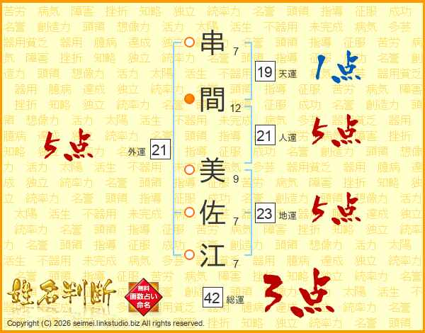 串(7画)間(12画) 美(9画)佐(7画)江(7画)