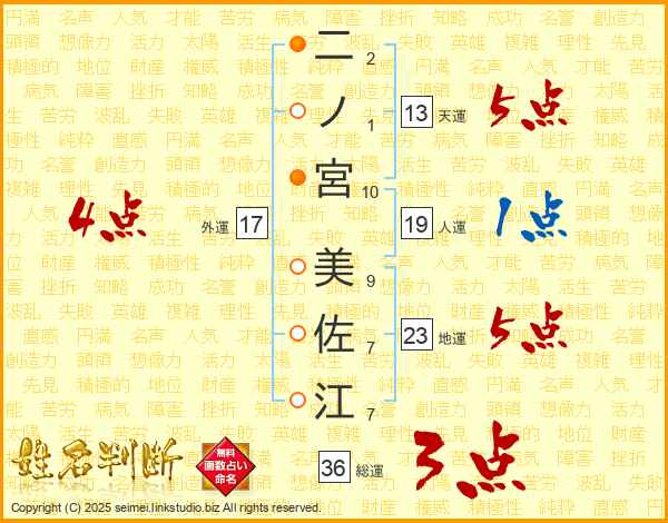 二(2画)ノ(1画)宮(10画) 美(9画)佐(7画)江(7画)