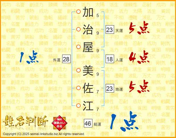 加(5画)治(9画)屋(9画) 美(9画)佐(7画)江(7画)