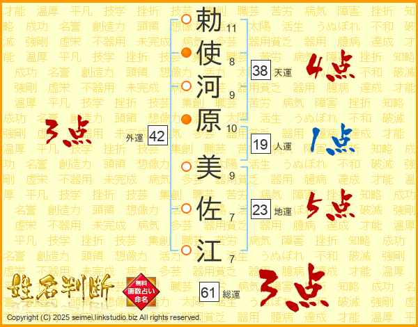 勅(11画)使(8画)河(9画)原(10画) 美(9画)佐(7画)江(7画)