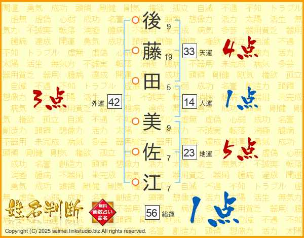 後(9画)藤(19画)田(5画) 美(9画)佐(7画)江(7画)
