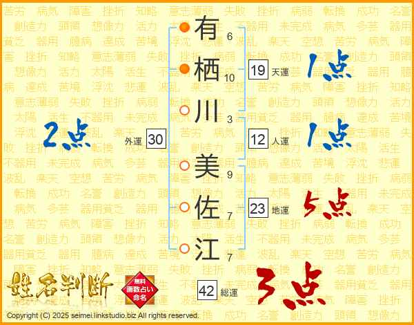 有(6画)栖(10画)川(3画) 美(9画)佐(7画)江(7画)