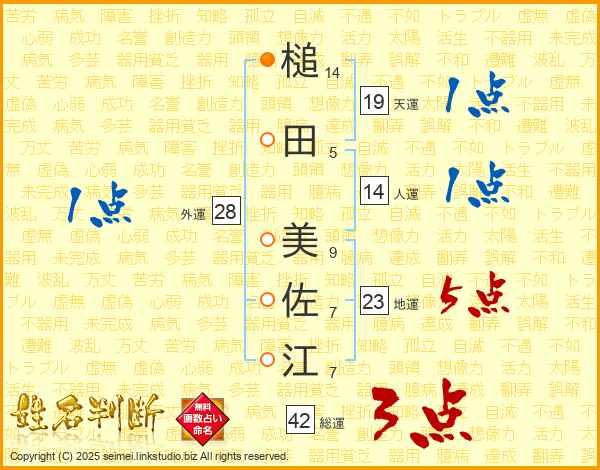 槌(14画)田(5画) 美(9画)佐(7画)江(7画)