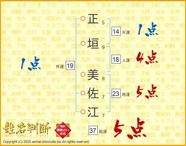正(5画)垣(9画) 美(9画)佐(7画)江(7画)