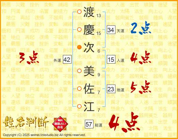 渡(13画)慶(15画)次(6画) 美(9画)佐(7画)江(7画)