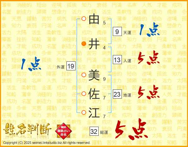 由(5画)井(4画) 美(9画)佐(7画)江(7画)