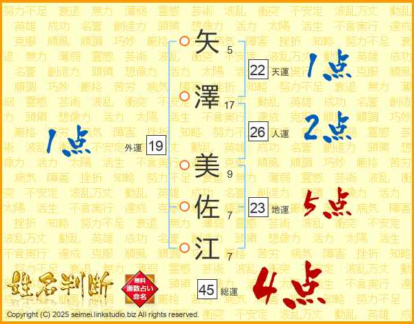 矢(5画)澤(17画) 美(9画)佐(7画)江(7画)