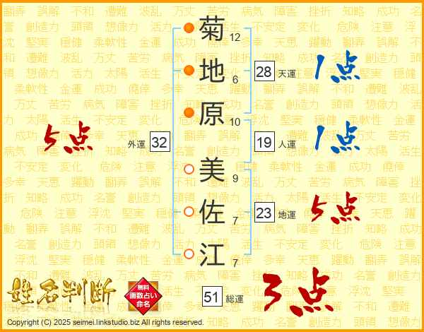 菊(12画)地(6画)原(10画) 美(9画)佐(7画)江(7画)