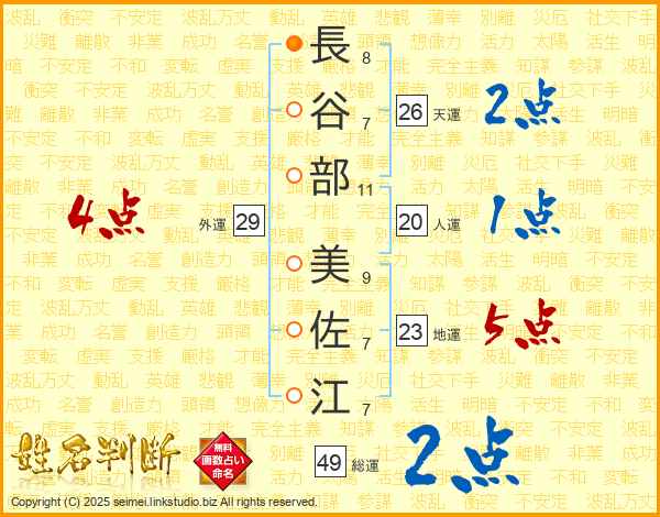 長(8画)谷(7画)部(11画) 美(9画)佐(7画)江(7画)