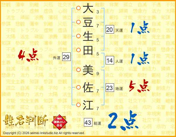 大(3画)豆(7画)生(5画)田(5画) 美(9画)佐(7画)江(7画)
