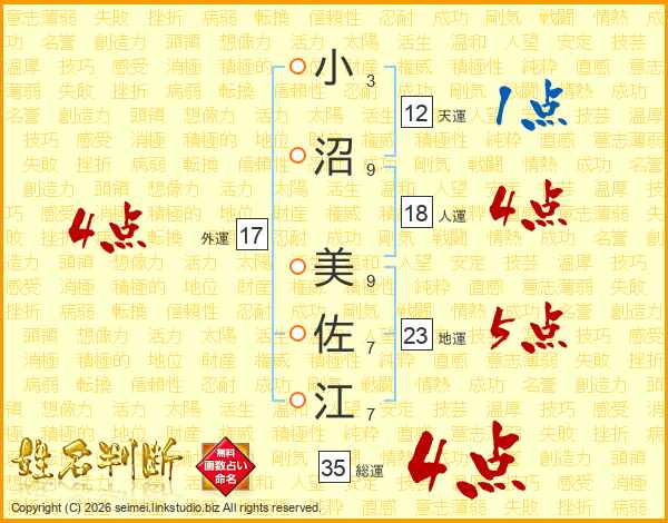小(3画)沼(9画) 美(9画)佐(7画)江(7画)
