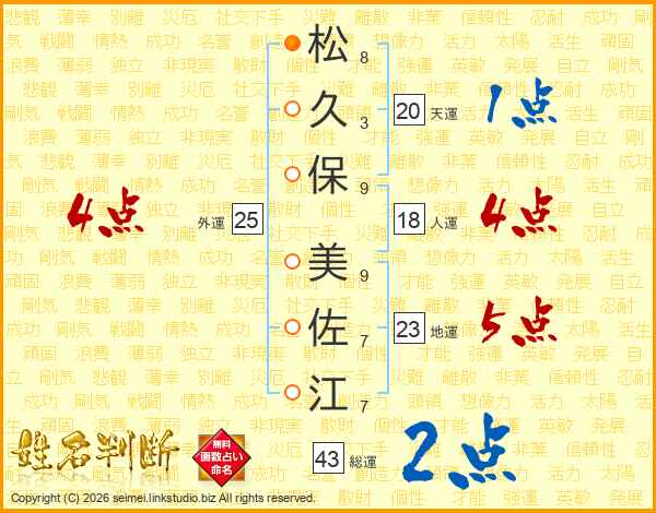 松(8画)久(3画)保(9画) 美(9画)佐(7画)江(7画)