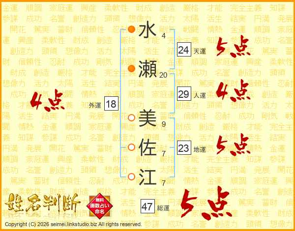 水(4画)瀬(20画) 美(9画)佐(7画)江(7画)