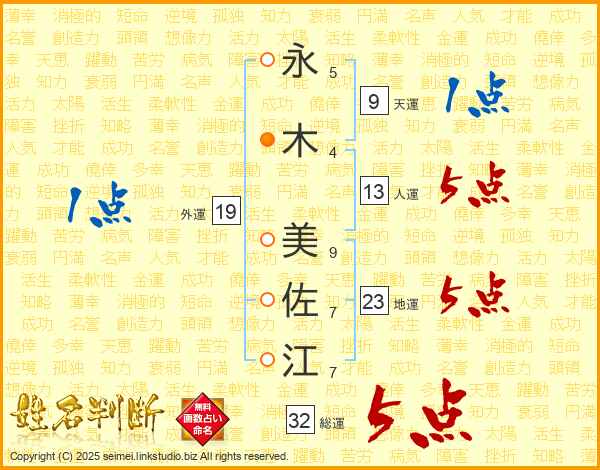 永(5画)木(4画) 美(9画)佐(7画)江(7画)