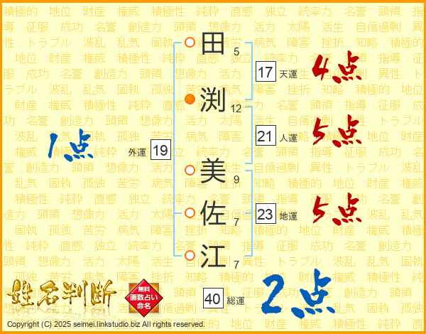 田(5画)渕(12画)  美(9画)佐(7画)江(7画)