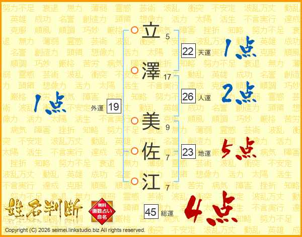 立(5画)澤(17画) 美(9画)佐(7画)江(7画)