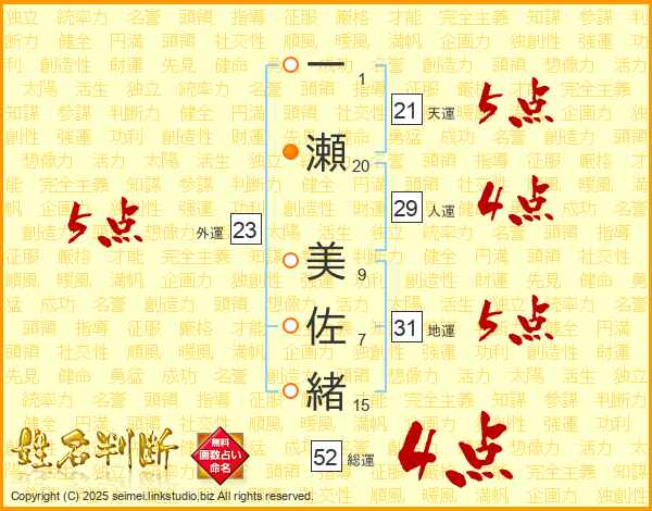 一(1画)瀬(20画) 美(9画)佐(7画)緒(15画)