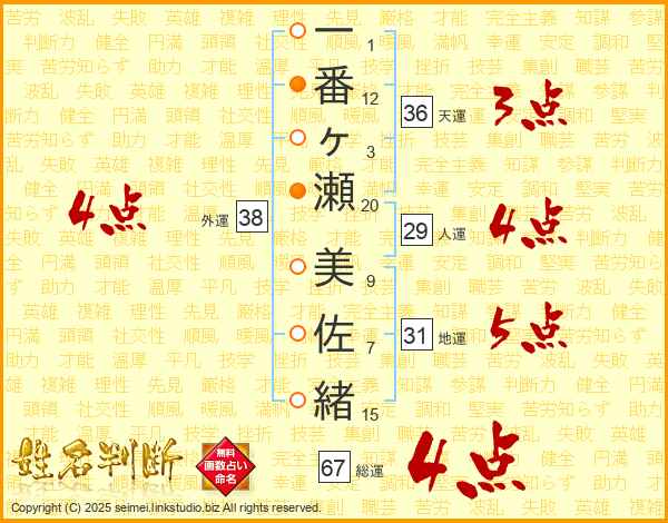 一番ヶ瀬美佐緒さんの外運は38画の4点!