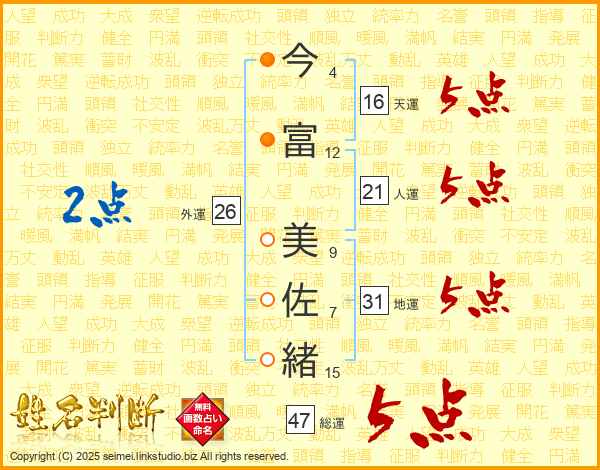 今(4画)富(12画) 美(9画)佐(7画)緒(15画)