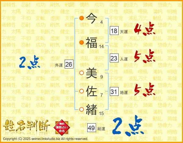 今(4画)福(14画) 美(9画)佐(7画)緒(15画)