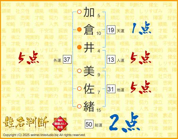 加(5画)倉(10画)井(4画) 美(9画)佐(7画)緒(15画)