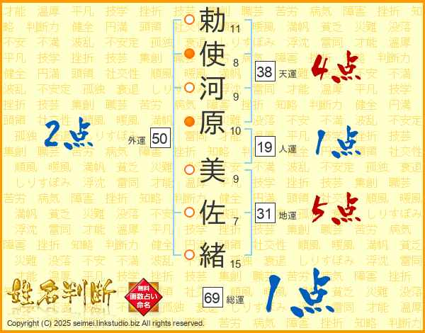 勅(11画)使(8画)河(9画)原(10画) 美(9画)佐(7画)緒(15画)