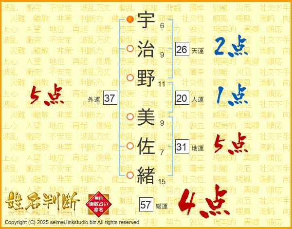 宇(6画)治(9画)野(11画) 美(9画)佐(7画)緒(15画)
