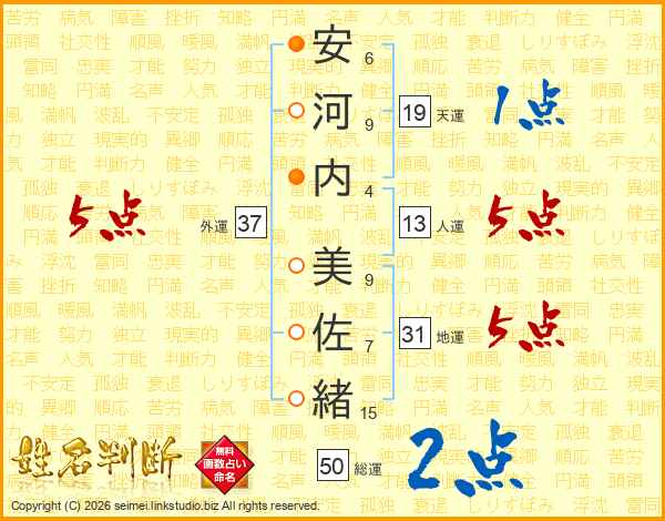 安(6画)河(9画)内(4画) 美(9画)佐(7画)緒(15画)